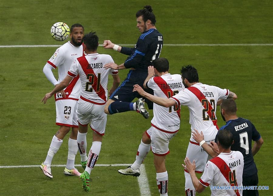 MADRID, 23 abr (Xinhua) -- El equipo de fútbol Real Madrid ganó hoy 3-2 al Rayo Vallecano guiados por el galés Gareth Bale, autor de dos goles que le permiten al conjunto blanco seguir en la lucha por el campeonato de la Liga española.