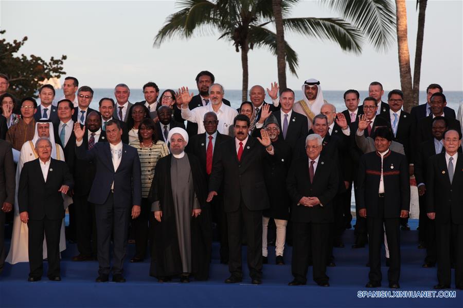 MARGARITA, septiembre 17, 2016 (Xinhua) -- Los presidentes de Venezuela, Nicolás Maduro (c-frente), de Irán, Hassan Rouhani (3-i-frente), de Bolivia, Evo Morales (2-d-frente), de Ecuador, Rafael Correa (2-i-frente), de El Salvador, Salvador Sánchez Cerén (i-frente) y el presidente palestino Mahmoud Abbas (3-d-frente), posan en el marco de la XVII Cumbre del Movimiento de Países No Alineados (MNOAL), en la isla de Margarita, Venezuela, el 17 de septiembre de 2016. La reunión de jefes de Estado y de Gobierno de la XVII Cumbre del Movimiento de Países No Alineados (MNOAL) inició formalmente el sábado en la caribeña isla de Margarita, al norte insular de Venezuela. El presidente de Venezuela, Nicolás Maduro, recibió en el Centro de Convenciones Hugo Chávez Frías, del hotel Venetur de la isla, a por lo menos 14 presidentes y primeros ministros así como vicepresidentes y altos representantes de más de 15 naciones de Africa, Asia y América Latina. (Xinhua/Boris Vergara)