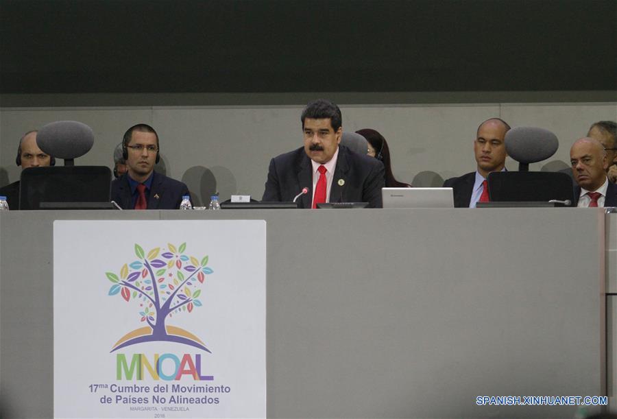 MARGARITA, septiembre 17, 2016 (Xinhua) -- El presidente de Venezuela, Nicolás Maduro (c-frente), participa durante la XVII Cumbre del Movimiento de Países No Alineados (MNOAL), en el Centro de Convenciones Hugo Chávez Frías, en la isla de Margarita, Venezuela, el 17 de septiembre de 2016. La reunión de jefes de Estado y de Gobierno de la XVII Cumbre del Movimiento de Países No Alineados (MNOAL) inició formalmente el sábado en la caribeña isla de Margarita, al norte insular de Venezuela. El presidente de Venezuela, Nicolás Maduro, recibió en el Centro de Convenciones Hugo Chávez Frías, del hotel Venetur de la isla, a por lo menos 14 presidentes y primeros ministros así como vicepresidentes y altos representantes de más de 15 naciones de Africa, Asia y América Latina. (Xinhua/Boris Vergara)