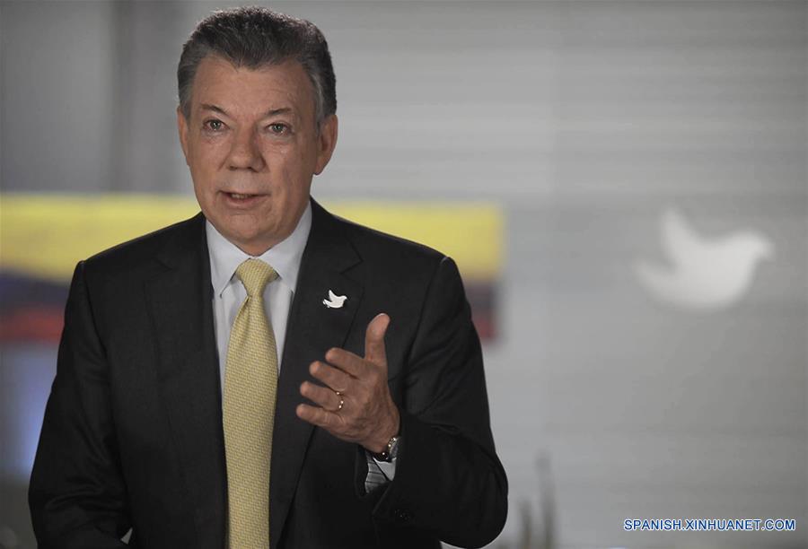 BOGOTA, octubre 13, 2016 (Xinhua) -- Imagen cedida por la Presidencia de Colombia, del presidente colombiano, Juan Manuel Santos, ofreciendo un mensaje televisado desde Casa de Nariño, en Bogotá, Colombia, el 13 de octubre de 2016. De acuerdo con información de la prensa local, Santos anunció el jueves que tomó la decisión de prorrogar el cese al fuego bilateral con las Fuerzas Armadas Revolucionarias de Colombia (FARC) hasta el 31 de diciembre de 2016, remarcando que ello no representa un ultimátum ni una fecha límite. (Xinhua/Juan David Tena/Presidencia de Colombia)