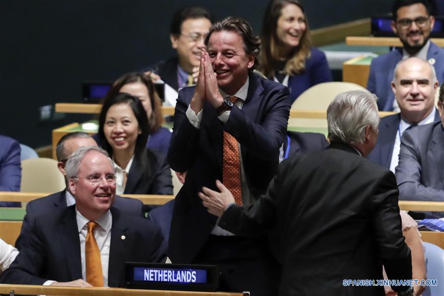 NUEVA YORK, junia 2, 2017 (Xinhua) -- El ministro de Relaciones Exteriores de Países Bajos, Bert Koenders (c), festeja después de que Países Bajos fue elegido como miembro no permanente para el Consejo de Seguridad de la Organización de las Naciones Unidas (ONU), en la sede de la ONU en Nueva York, Estados Unidos, el 2 de junio de 2017. La Asamblea General de la ONU eligió el viernes a Cote d'Ivoire, Guinea Ecuatorial, Kuwait, Polonia y Perú como miembros no permanentes del Consejo de Seguridad de la ONU para un periodo de dos años que comenzará el 1 de enero del 2018. El viernes con anterioridad, la Asamblea General también eligió a Países Bajos como miembro no permanente del consejo para un período de un año a partir del 1 de enero de 2018 luego del empate entre Italia y Países Bajos en las elecciones del año pasado. (Xinhua/Li Muzi)