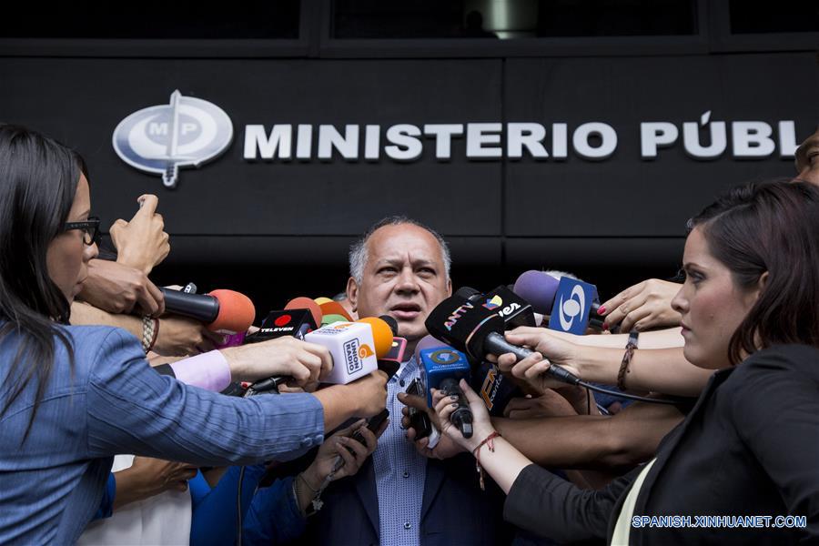 CARACAS, agosto 16, 2017 (Xinhua) -- Diosdado Cabello (c), constituyente y dirigente del gobernante Partido Socialista Unido de Venezuela (PSUV), conversa con representantes de los medios de comunicación frente a la sede del Ministerio Público, en Caracas, Venezuela, el 16 de agosto de 2017. Integrantes de la Asamblea Nacional Constituyente (ANC) de Venezuela denunciaron el miércoles ante el Ministerio Público (MP) una presunta red de extorsiones que involucra al esposo de la exfiscal general, Luisa Ortega. Diosdado Cabello, constituyente y dirigente del gobernante Partido Socialista Unido de Venezuela (PSUV), encabezó la denuncia ante el nuevo fiscal general, Tarek William Saab, a quien entregó documentos "originales" que señalan depósitos superiores a seis millones de dólares estadounidenses. Posteriormente, el MP ordenó investigar al diputado Germán Ferrer, esposo de la exfiscal Luis Ortega, por presuntos vínculos con una red de extorsionadores. (Xinhua/Francisco Bruzco)