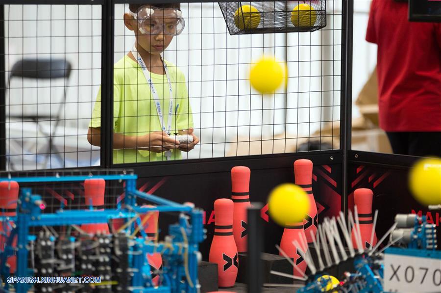 BEIJING, agosto 23, 2017 (Xinhua) -- Un concursante participa en un encuentro durante la Conferencia Mundial de Robots 2017 en Beijing, capital de China, el 23 de agosto de 2017. La conferencia robótica de cinco días de duración comenzó el miércoles bajo el tema, "Innovación Colaborativa Ganar-Ganar Hacia la Construcción de una Sociedad Inteligente". (Xinhua/Jin Liwang)