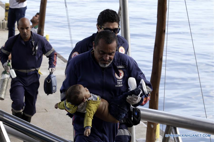 BAHIA, agosto 24, 2017 (Xinhua) -- Miembros del equipo de rescate trasladan a una víctima de un naufragio en Salvador, capital del estado de Bahía, Brasil, el 24 de agosto de 2017. Al menos 22 personas murieron la mañana del jueves en Brasil y 21 fueron rescatadas con vida, después de que una embarcación naufragó en el cruce entre Vera Cruz en la isla de Itaparica y Salvador, en Bahía de Todos los Santos, informó la Marina brasileña. (Xinhua/Xando Pereira/AGENCIA ESTADO)