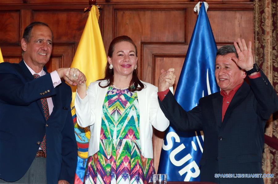 QUITO, septiembre 4, 2017 (Xinhua) -- El jefe negociador del Gobierno de Colombia, Juan Camilo Restrepo (i), la canciller ecuatoriana, María Fernanda Espinosa (c), y el jefe negociador del Ejército de Liberación Nacional (ELN), Pablo Beltrán (d), participan durante un anuncio en el Salón Los Próceres de la Cancillería ecuatoriana, en Quito, capital de Ecuador, el 4 de septiembre de 2017. El gobierno de Colombia y el Ejército de Liberación Nacional (ELN) firmaron el lunes en Quito, Ecuador, un acuerdo de cese al fuego bilateral temporal que permitirá reducir la intensidad del conflicto armado y mejorar la situación humanitaria de la población. El cese al fuego se iniciará a partir del 1 de octubre y tendrá una duración de 102 días, anunciaron los jefes de los equipos negociadores del gobierno, Juan Camilo Restrepo, y del ELN, Pablo Beltrán, en la sede de la cancillería ecuatoriana. (Xinhua/Santigo Armas)
