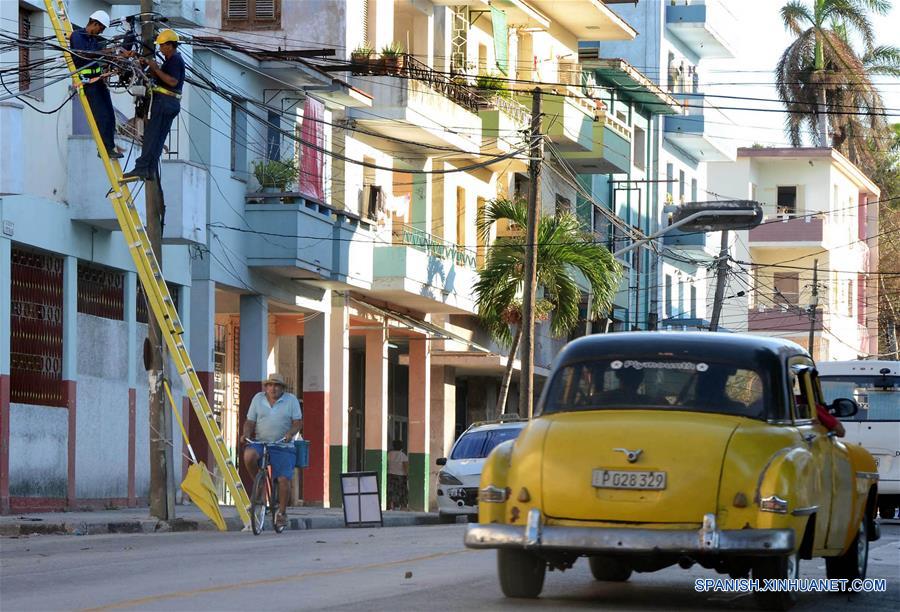LA HABANA, septiembre 17, 2017 (Xinhua) -- Empleados revisan cables de electricidad en el municipio Cerro, en La Habana, Cuba, el 17 de septiembre de 2017. Una semana después del paso del huracán Irma por Cuba, los habitantes de la isla se esfuerzan por recuperarse de los destrozos causados por el violento meteoro que alcanzó la categoría cinco, la máxima de la escala Saffir-Simpson. Miles de cubanos salieron este fin de semana a las calles de La Habana en cumplimiento de un llamado gubernamental para cooperar con el saneamiento de la capital, donde viven más de dos millones de personas. El paso de Irma, considerado el mayor huracán formado en el Atlántico, dejó de manera preliminar 10 muertos, 1,7 millones de personas desalojadas, fuertes inundaciones y graves daños en el sistema eléctrico nacional. (Xinhua/Joaquín Hernández)