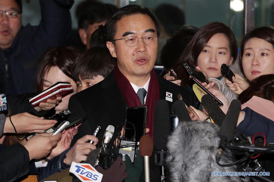 SEUL, enero 9, 2018 (Xinhua) -- El ministro de Unificación de República de Corea, Cho Myoung-gyon (c), conversa con representantes de los medios de comunicación previo a su salida para las conversaciones de alto nivel intercoreanas, en Seúl, República de Corea, el 9 de enero de 2018. Las delegaciones surcoreana y de la República Popular Democrática de Corea (RPDC) dieron inicio el martes a un diálogo intergubernamental de alto nivel en la aldea de la tregua de Panmunjom, informó el Ministerio de Unificación surcoreano. (Xinhua/Lee Sang-ho)
