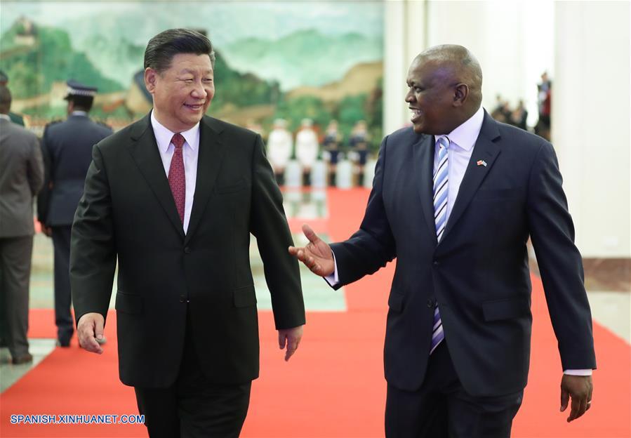 BEIJING, agosto 31, 2018 (Xinhua) -- El presidente de China, Xi Jinping (i), conversa con el presidente de Botswana, Mokgweetsi Masisi, en una ceremonia de bienvenida previa a sus conversaciones, en el Gran Palacio del Pueblo en Beijing, capital de China, el 31 de agosto de 2018. (Xinhua/Ju Peng)