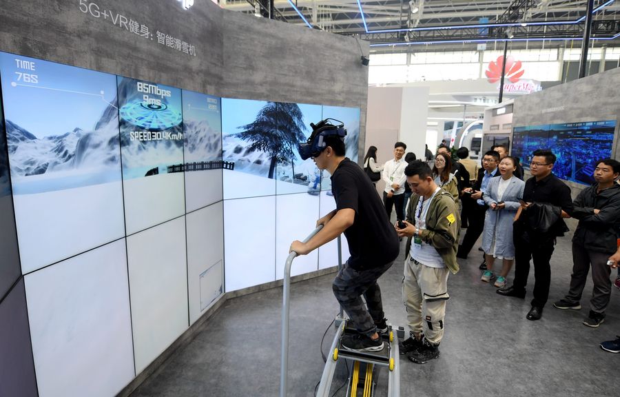 Imagen del 11 de octubre de 2019 de un visitante probando el esquí inteligente a través de Realidad Virtual (RV) en la Exposición Internacional de la Economía Digital de China, en Shijiazhuang, en la provincia norteña china de Hebei. (Xinhua/Wang Xiao)