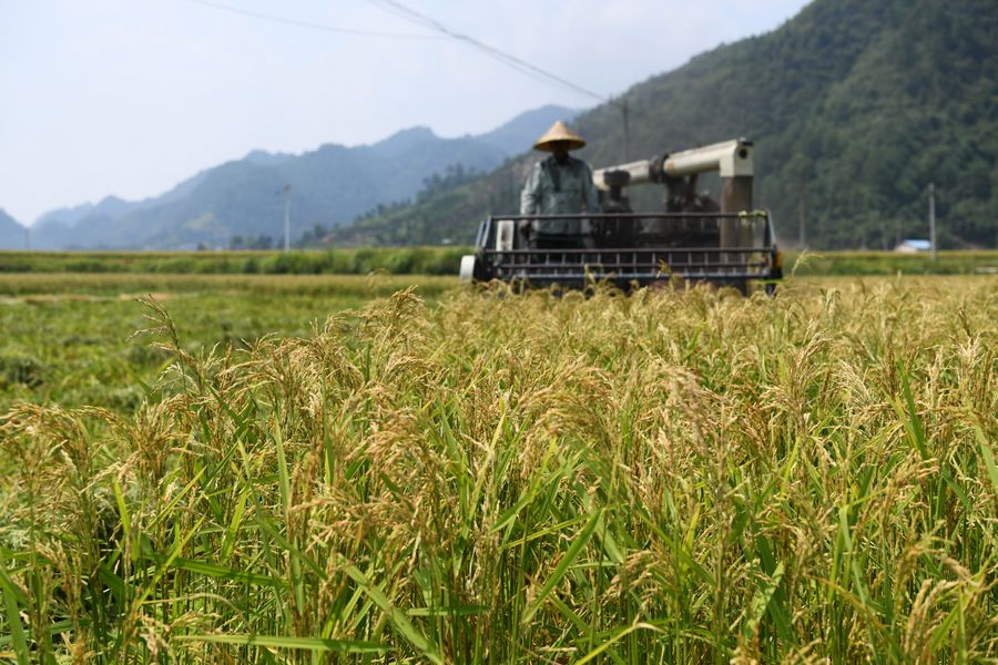 Un campesino cosecha semillas de arroz híbrido en una base nacional de producción de esta clase de cereal en el poblado de Zhuxi, en el distrito de Cengong, perteneciente a la provincia suroccidental china de Guizhou, el 20 de agosto de 2019. (Xinhua/Yang Wenbin)