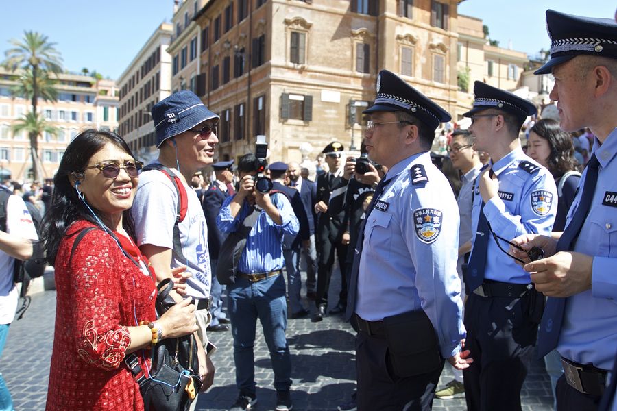 Policías chinos conversan con turistas en la Plaza de España, en Roma, Italia, el 5 de junio de 2017. (Xinhua/Jin Yu)