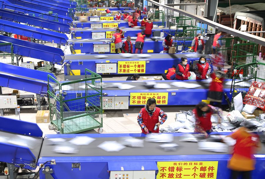 Empleados trabajan en el centro de distribución de la sucursal de Hengyang de China Post, en la ciudad de Hengyang, en la provincia de Hunan, en el centro de China, el 12 de noviembre de 2018. (Xinhua/Cao Zhengping)