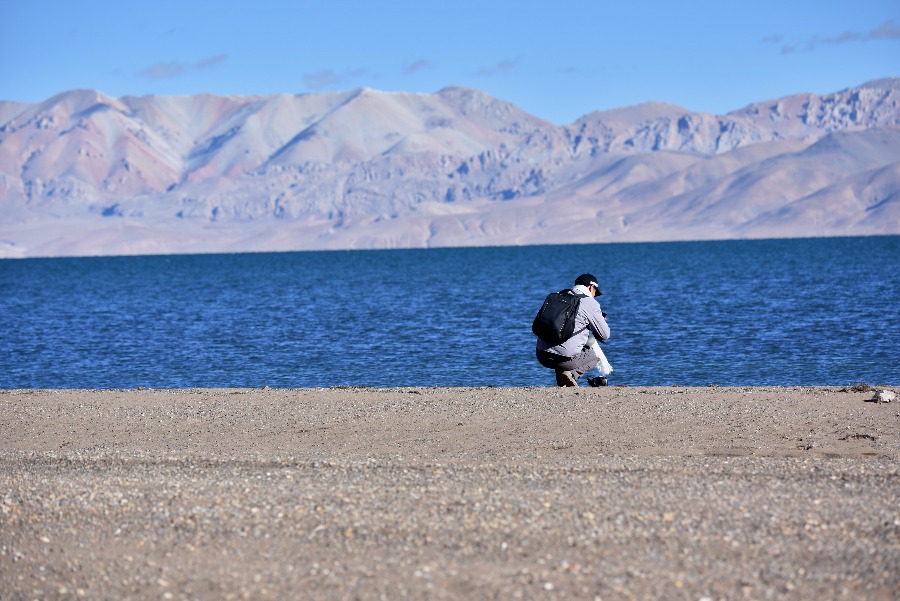 Un turista toma fotos junto al lago Cering Co, en el distrito de Xainza de la región autónoma del Tíbet, en el suroeste de China, el 12 de octubre de 2019. (Xinhua/Zhou Jinshuai)