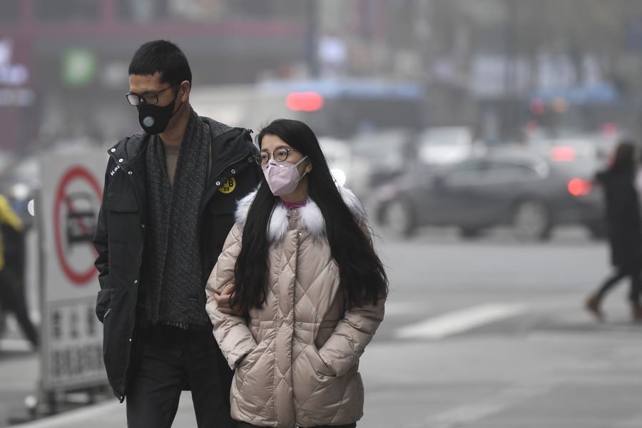 Esta foto, tomada el 18 de enero de 2018, muestra peatones con tapabocas en un día de contaminación en Hangzhou, capital de la provincia oriental china de Zhejiang. (Xinhua/Huang Zongzhi)