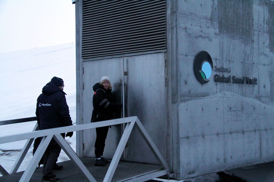 Imagen del 26 de febrero de 2018 de personas a la entrada del banco mundial de semillas de Svalbard, en Noruega. (Xinhua/Liang Youchang)