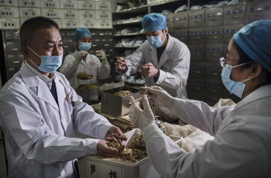 Trabajadores de la salud en una farmacia de medicina tradicional china en la ciudad de Weinan, provincia de Shaanxi, en el noroeste de China, el 20 de febrero de 2020. (Xinhua/Tao Ming)