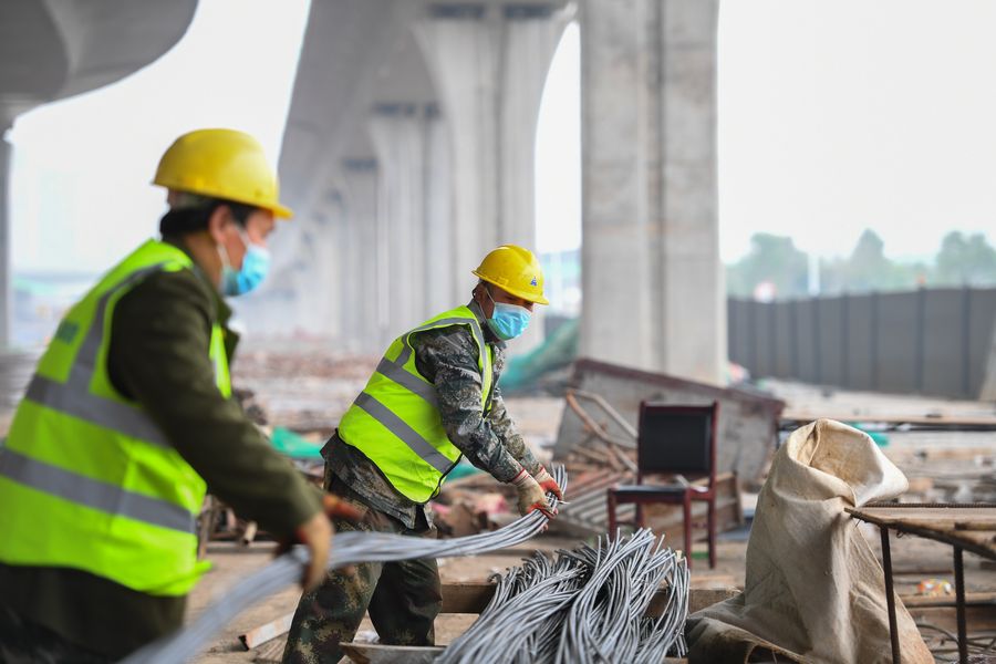 Constructores trabajan en el sitio de construcción de un proyecto de mejoramiento vial en Changsha, provincia de Hunan, en el centro de China, el 26 de febrero de 2020. (Xinhua/Chen Zeguo)