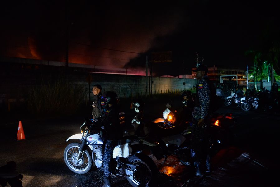 Elementos de la Policía vigilan cerca de las instalaciones del Consejo Nacional Electoral (CNE) venezolano donde se registró un incendio en Filas de Mariche, estado de Miranda, Venezuela, el 7 de marzo de 2020. (Xinhua/Marcos Salgado)