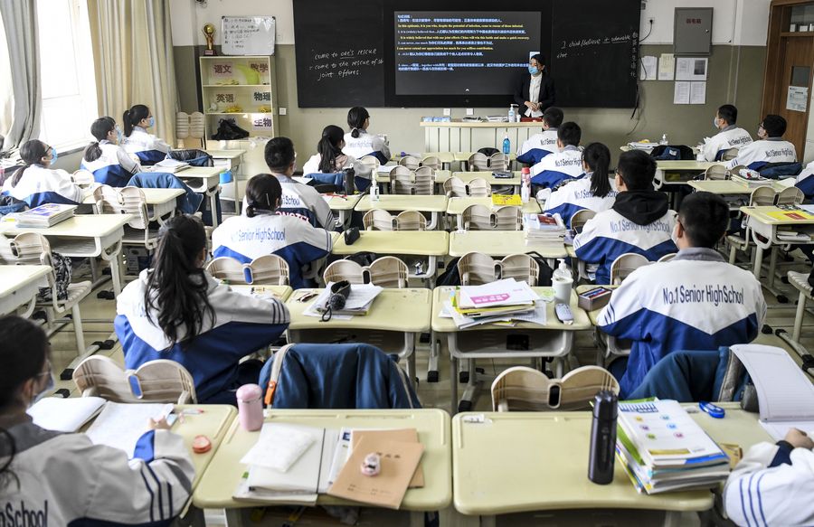 Aspecto de una clase de inglés en la Escuela Secundaria Superior No.1 de Urumqi, capital de la región autónoma uygur de Xinjiang, en el noroeste de China, el 19 de marzo de 2020. (Xinhua/Wang Fei)