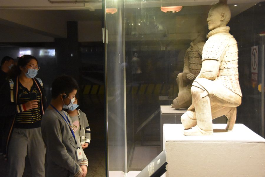 Visitantes con mascarillas contemplan una exihibición en el Museo del Mausoleo del Emperador Qinshihuang en Xi'an, capital de la provincia noroccidental china de Shaanxi, el 25 de marzo de 2020. (Xinhua/Yang Yimiao)