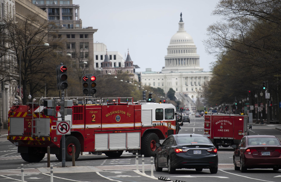 Vehículos de bomberos circulan por una calle aledaña al edificio del Capitolio, en Washington, D.C., Estados Unidos, el 27 de marzo de 2020. (Xinhua/Liu Jie)