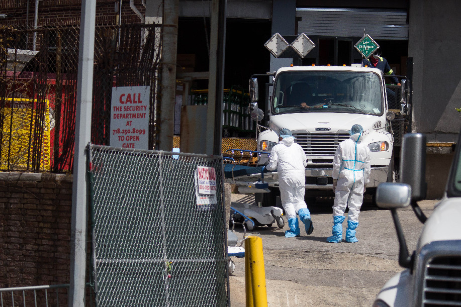Trabajadores sanitarios empujan una camilla hospitalaria luego de trasladar a los pacientes fallecidos a una morgue temporal afuera del centro hospitalario de Brooklyn durante la pandemia del nuevo coronavirus, en el barrio de Brooklyn, en Nueva York, Estados Unidos. (Xinhua/Michael Nagle)