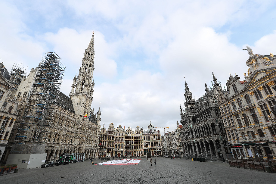 La plaza central de Bruselas en Bélgica, conocida como Grand Place, permanece vacía, el 13 de abril de 2020. (Xinhua/Zheng Huansong)