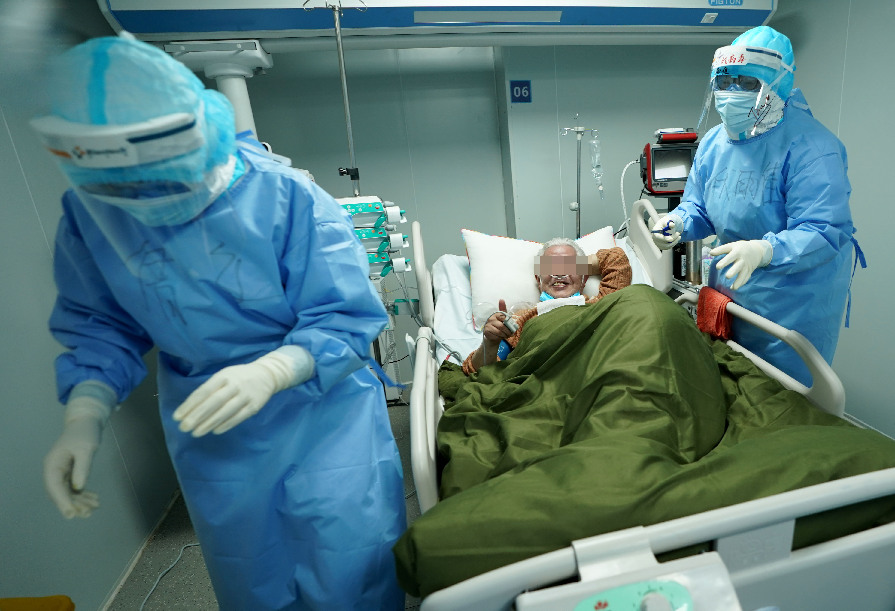 Un paciente con COVID-19 cuya condición ha mejorado da ánimos a los trabajadores médicos de la Unidad de Cuidados Intensivos (UCI) del Hospital Huoshenshan (Montaña del Dios de Fuego) en Wuhan, capital provincial de Hubei, en el centro de China, el 17 de marzo de 2020. (Xinhua/Wang Yuguo)