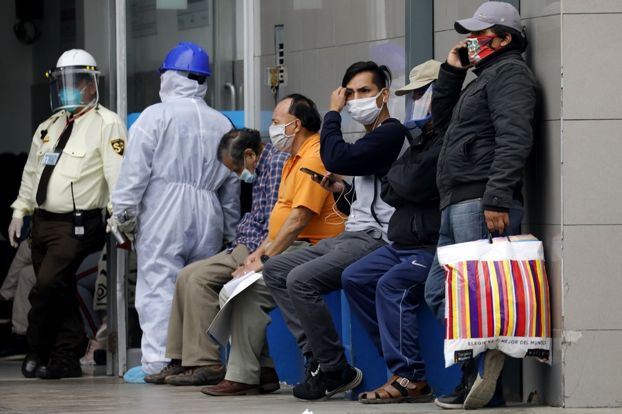 Personas portan mascarillas mientras esperan por atención afuera del Hospital III Angamos EsSalud durante la cuarentena impuesta para prevenir la enfermedad causada por el nuevo coronavirus (COVID-19), en Lima, Perú, el 15 de junio de 2020. (Xinhua/Mariana Bazo)