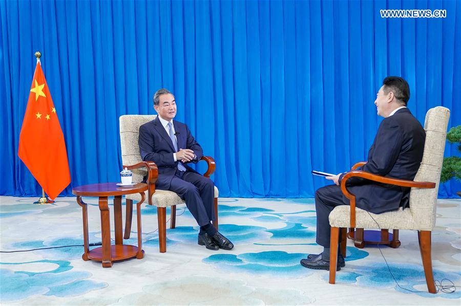 El consejero de Estado y ministro de Relaciones Exteriores chino, Wang Yi, da una entrevista exclusiva a Xinhua sobre las relaciones entre China y Estados Unidos en Beijing, capital de China, el 5 de agosto de 2020. (Xinhua/Zhai Jianlan)