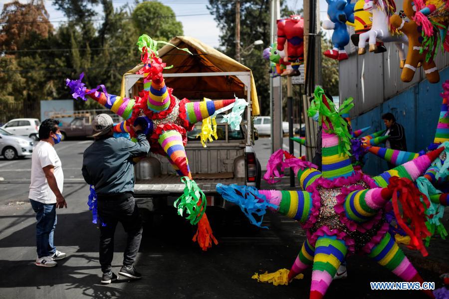 CIUDAD DE MEXICO, 14 diciembre, 2020 (Xinhua) -- Imagen del 4 de diciembre de 2020 de un integrante de la familia Estrella cargando una piñata tradicional de estrella en venta para las fiestas navideñas, en la Ciudad de México, capital de México. Jaime Estrella, artesano que elabora las tradicionales piñatas mexicanas, contó que para la temporada navideña tuvo que bajar los precios de sus productos con tal de alentar las ventas, a pesar de enfrentar costos más altos en los insumos, al cierre de un año complicado por la pandemia causada por el nuevo coronavirus (COVID-19). (Xinhua/Francisco Cañedo)