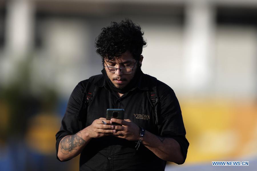 BRASILIA, 15 diciembre, 2020 (Xinhua) -- Un hombre revisa su teléfono móvil mientras camina por una calle del centro de Brasilia, Brasil, el 15 de diciembre de 2020. (Xinhua/Lucio Tavora)