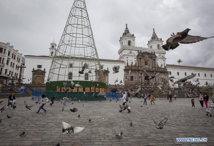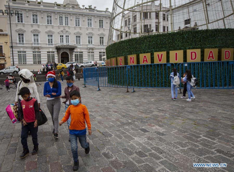 QUITO, 25 diciembre, 2020 (Xinhua) -- Una familia camina por la Plaza de San Francisco, durante el día de Navidad, en el Centro Histórico de Quito, capital de Ecuador, el 25 de diciembre de 2020. (Xinhua/Santiago Armas)