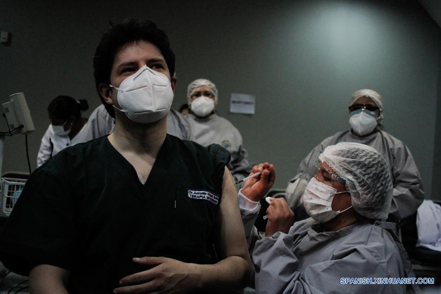 Un trabajador médico recibe una dosis de la vacuna rusa Sputnik V contra la enfermedad causada por el nuevo coronavirus (COVID-19) durante la campaña de vacunación contra la COVID-19, en el Hospital del Norte, en El Alto, Bolivia, el 30 de enero de 2021. Bolivia comenzó la inmunización contra la COVID-19 con la vacuna rusa Sputnik V, que en esta primera etapa está dirigida al personal de salud. (Xinhua/Mateo Romay)