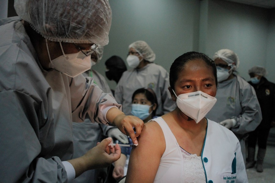 Una trabajadora médica recibe una dosis de la vacuna rusa Sputnik V contra la enfermedad causada por el nuevo coronavirus (COVID-19) durante la campaña de vacunación contra la COVID-19, en el Hospital del Norte, en El Alto, Bolivia, el 30 de enero de 2021. (Xinhua/Mateo Romay)