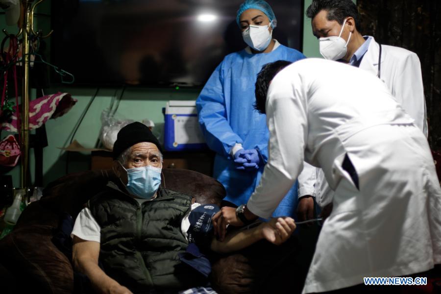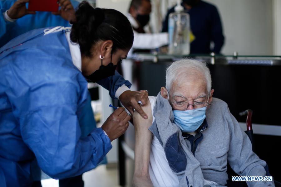 CIUDAD DE MEXICO, 18 febrero, 2021 (Xinhua) -- Una trabajadora de la salud aplica una vacuna contra la enfermedad del nuevo coronavirus (COVID-19) a Eduardo Salazar, de 90 años, en su domicilio en la Ciudad de México, capital de México, el 18 de febrero de 2021. México comenzó el lunes la segunda etapa de su plan nacional de vacunación contra la COVID-19 que incluye la inmunización de más de 15 millones de adultos mayores que viven en el país. (Xinhua/Francisco Cañedo)