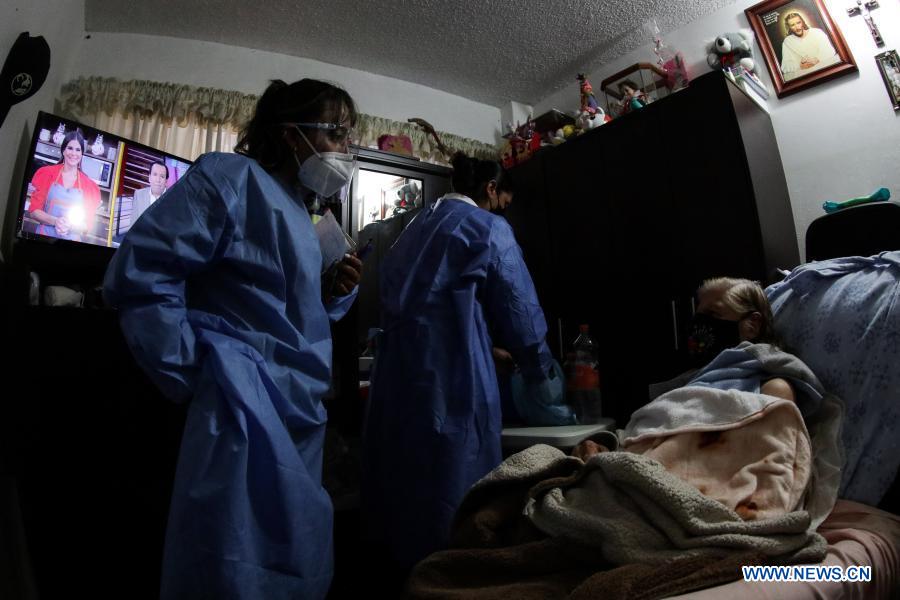 Un trabajador de la salud revisa los signos vitales de Gerardo Tapia, de 80 años, después de que recibiera una vacuna contra la enfermedad del nuevo coronavirus (COVID-19) en su domicilio, en la Ciudad de México, capital de México, el 18 de febrero de 2021. México comenzó el lunes la segunda etapa de su plan nacional de vacunación contra la COVID-19 que incluye la inmunización de más de 15 millones de adultos mayores que viven en el país. (Xinhua/Francisco Cañedo)