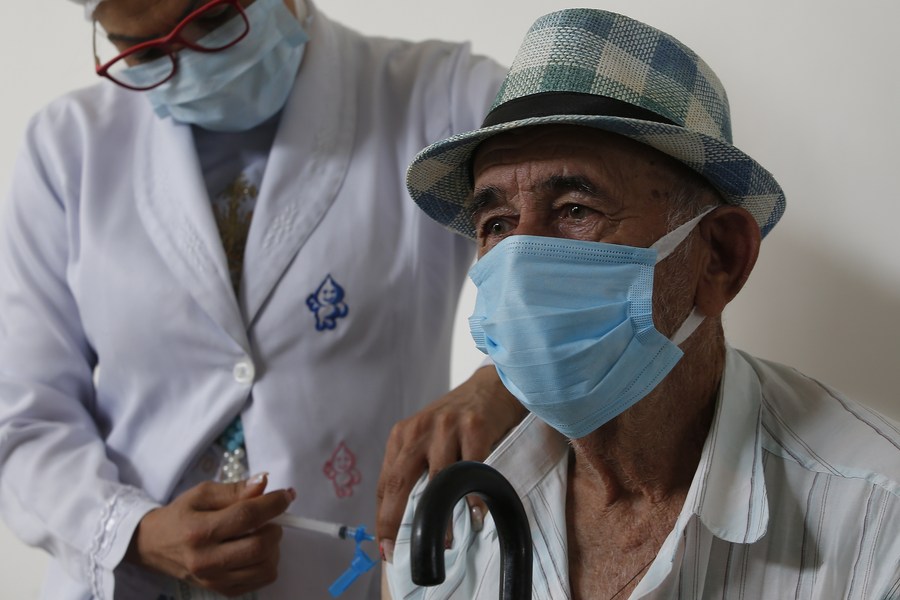 Una trabajadora de la salud aplica una vacuna contra la enfermedad del nuevo coronavirus (COVID-19) a un hombre durante una campaña de vacunación para personas de 79 años o más en un Centro de Salud, en Brasilia, Brasil, el 17 de febrero de 2021. (Xinhua/Lucio Tavora)