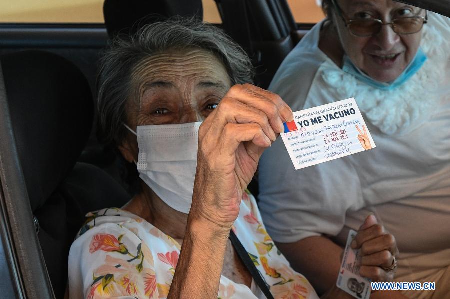 Una mujer de la tercera edad muestra su cartilla de vacunación después de recibir la vacuna contra la enfermedad del nuevo coronavirus (COVID-19), en un modulo de vacunación, en Santiago, capital de Chile, el 24 de febrero de 2021. El ministro de Salud de Chile, Enrique Paris, aseveró el miércoles que con el favorable progreso del plan de vacunación masivo contra la COVID-19 en el país esperan tener al 80 por ciento de la población vacunada a fines del primer semestre del año y con esto lograr la "inmunidad de rebaño". (Xinhua/Jorge Villegas)
