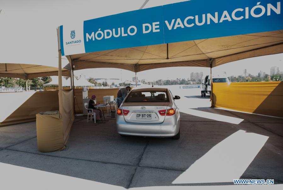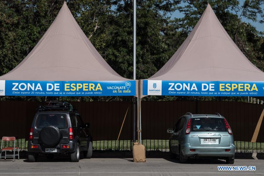 Personas de la tercera edad descansan a bordo de vehículos después de recibir la vacuna contra la enfermedad del nuevo coronavirus (COVID-19), en la zona de espera de un modulo de vacunación, en Santiago, capital de Chile, el 24 de febrero de 2021. El ministro de Salud de Chile, Enrique Paris, aseveró el miércoles que con el favorable progreso del plan de vacunación masivo contra la COVID-19 en el país esperan tener al 80 por ciento de la población vacunada a fines del primer semestre del año y con esto lograr la "inmunidad de rebaño". (Xinhua/Jorge Villegas)