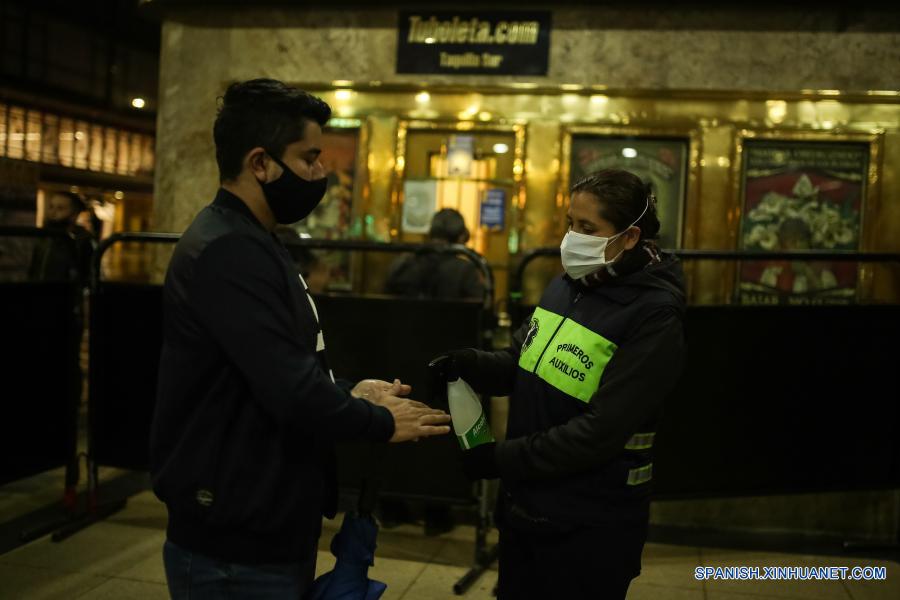 Imagen del 12 de marzo de 2021 de una trabajadora ofreciendo gel antibacterial a un visitante previo a su ingreso al teatro Jorge Eliécer Gaitán, en Bogotá, Colombia. Tras todo un año de cierre ante la llegada de la enfermedad del nuevo coronavirus (COVID-19) a Colombia, el teatro Jorge Eliécer Gaitán abrió el viernes sus puertas bajo estrictas medidas de seguridad biológica para presentar la obra Campo Muerto, de la compañía colombiana Danza Común. (Xinhua/Jhon Paz)