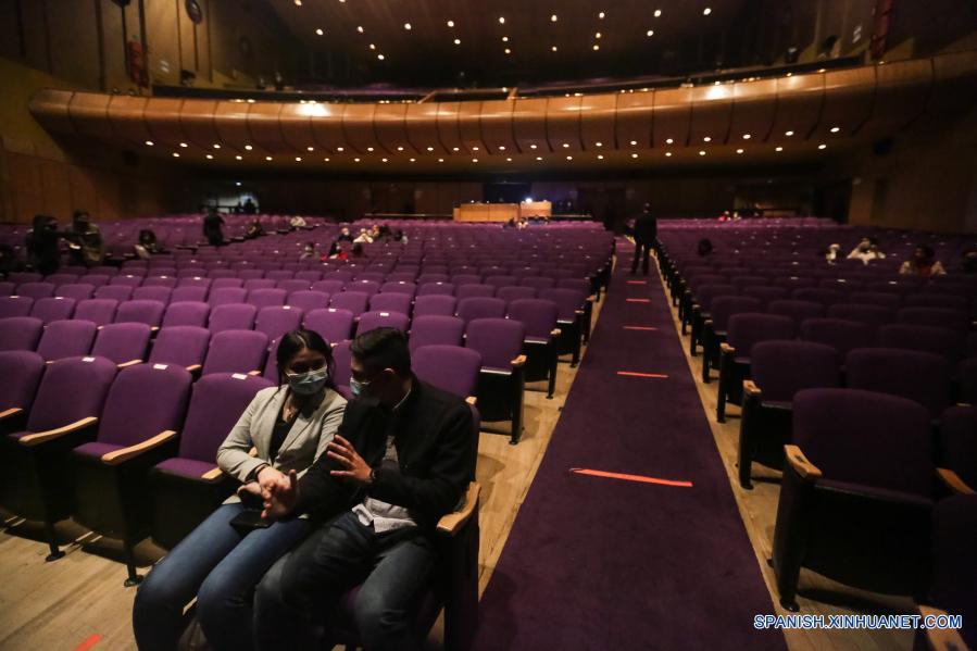Imagen del 12 de marzo de 2021 de personas conversando previo a una obra de danza, en el teatro Jorge Eliécer Gaitán, en Bogotá, Colombia. Tras todo un año de cierre ante la llegada de la enfermedad del nuevo coronavirus (COVID-19) a Colombia, el teatro Jorge Eliécer Gaitán abrió el viernes sus puertas bajo estrictas medidas de seguridad biológica para presentar la obra Campo Muerto, de la compañía colombiana Danza Común. (Xinhua/Jhon Paz)