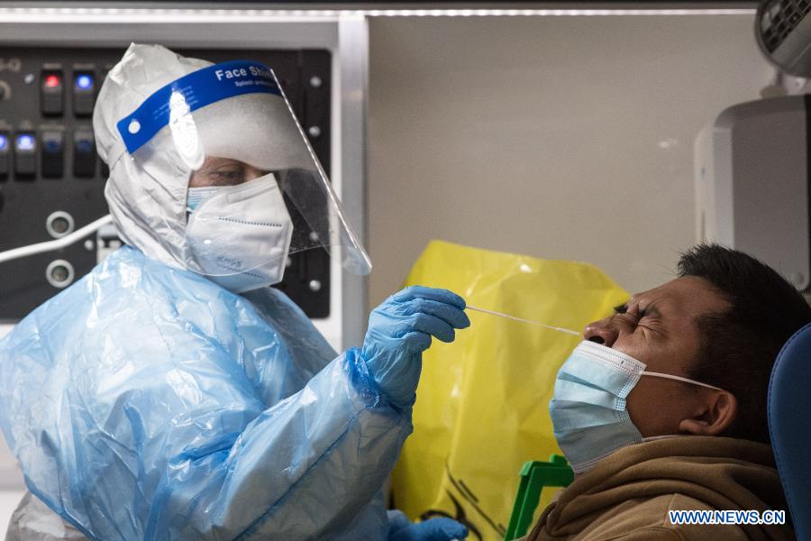 SANTIAGO, 15 marzo, 2021 (Xinhua) -- Una trabajadora de salud recolecta una muestra de hisopado nasal a un hombre para una prueba de detección de la enfermedad del nuevo coronavirus (COVID-19), en Santiago, capital de Chile, el 15 de marzo de 2021. El ministro de Salud chileno, Enrique Paris, señaló en rueda de prensa que en los últimos días se ha observado un aumento persistente de casos de la COVID-19, incremento que también se observó "en otros países después de las vacaciones de verano" en el hemisferio sur. (Xinhua/Jorge Villegas)