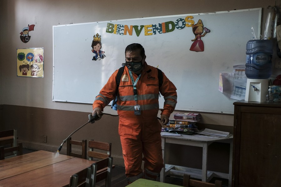 Un trabajador de la Alcaldía de La Paz desinfecta un aula de la Unidad Educativa Macaria Pinilla previo al retorno a clases de forma presencial, en La Paz, Bolivia, el 27 de julio de 2022. (Xinhua/Mateo Romay)
