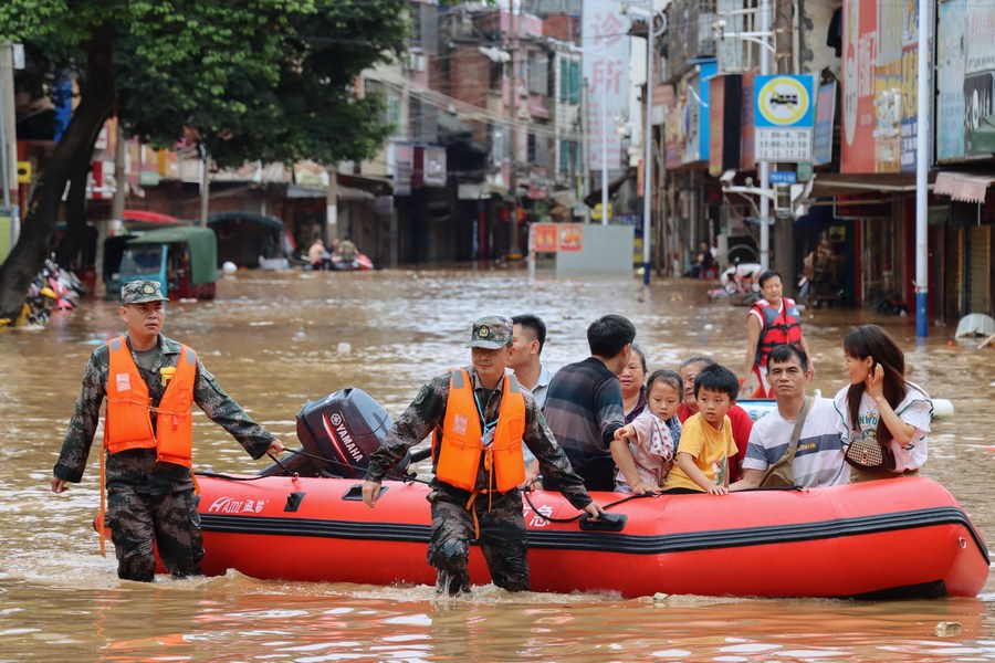 Rescatistas evacúan a residentes que se han quedado varados por la inundación en el poblado de Tuojiang del distrito autónomo de la etnia yao de Jianghua, en Yongzhou, provincia central china de Hunan, el 22 de junio de 2022. (Xinhua/Jiang Linfeng)
