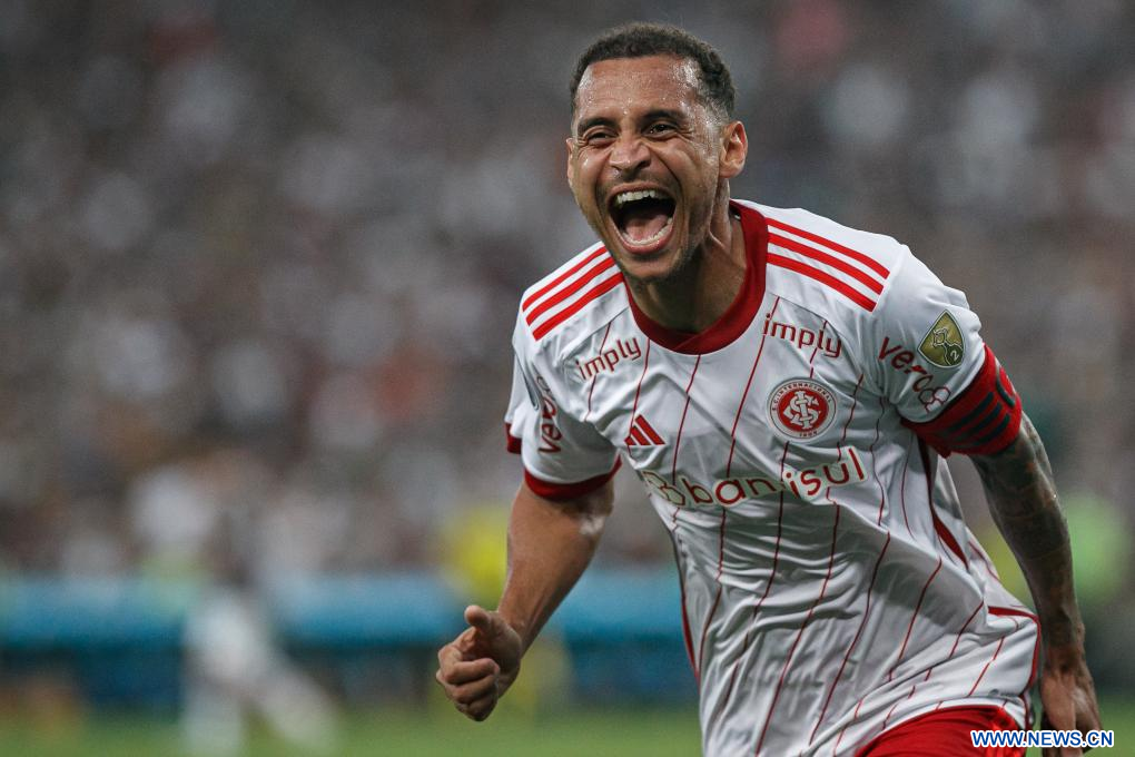 Imagen del 27 de septiembre de 2023 del jugador Alan Patrick, de Internacional, de Brasil, festejando una anotación durante el partido de ida correspondiente a las semifinales de la Copa Libertadores de América ante Fluminense, de Brasil, celebrado en el Estadio Maracaná, en Río de Janeiro, Brasil. (Xinhua/Claudia Martini)