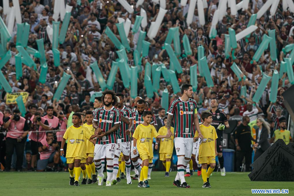 RÍO DE JANEIRO, 28 septiembre, 2023 (Xinhua) -- Imagen del 27 de septiembre de 2023 de jugadores de Fluminense, de Brasil, entrando al campo junto a niños previo al partido de ida correspondiente a las semifinales de la Copa Libertadores de América ante Internacional, de Brasil, celebrado en el Estadio Maracaná, en Río de Janeiro, Brasil. (Xinhua/Claudia Martini)