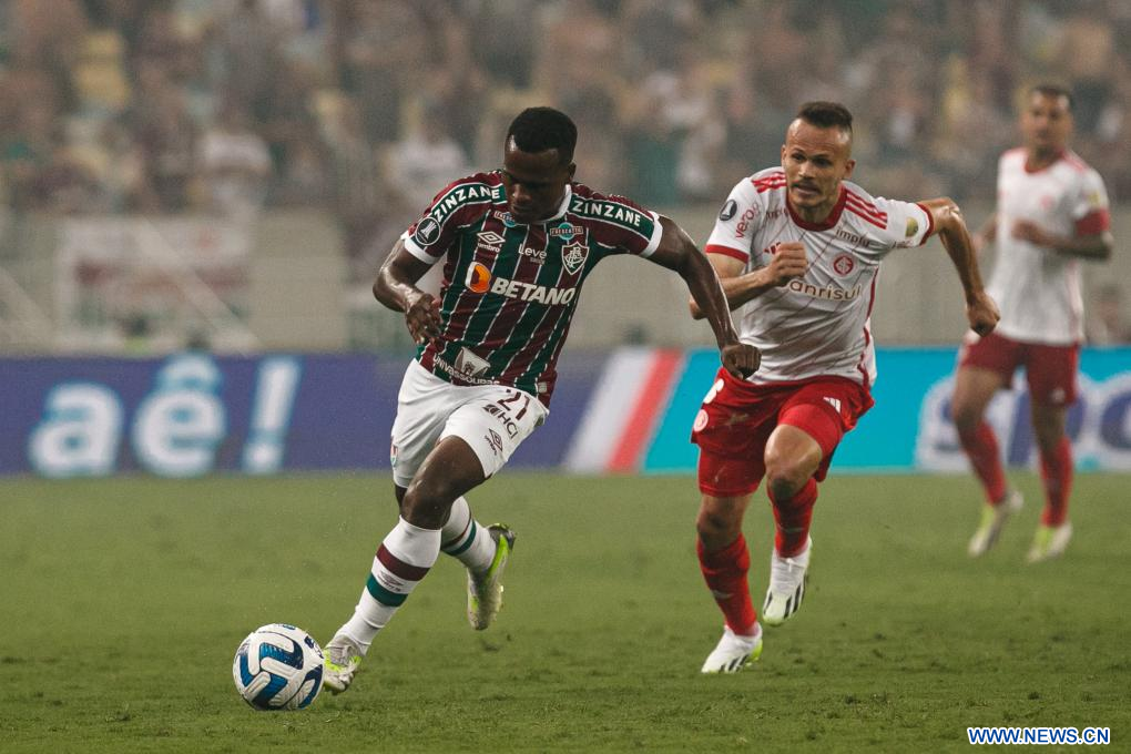 RÍO DE JANEIRO, 28 septiembre, 2023 (Xinhua) -- Imagen del 27 de septiembre de 2023 del jugador Jhon Arias (i), de Fluminense, de Brasil, disputando el balón con René (d), de Internacional, de Brasil, durante el partido de ida correspondiente a las semifinales de la Copa Libertadores de América, celebrado en el Estadio Maracaná, en Río de Janeiro, Brasil. (Xinhua/Claudia Martini)