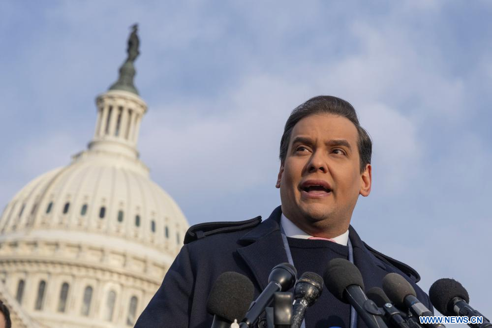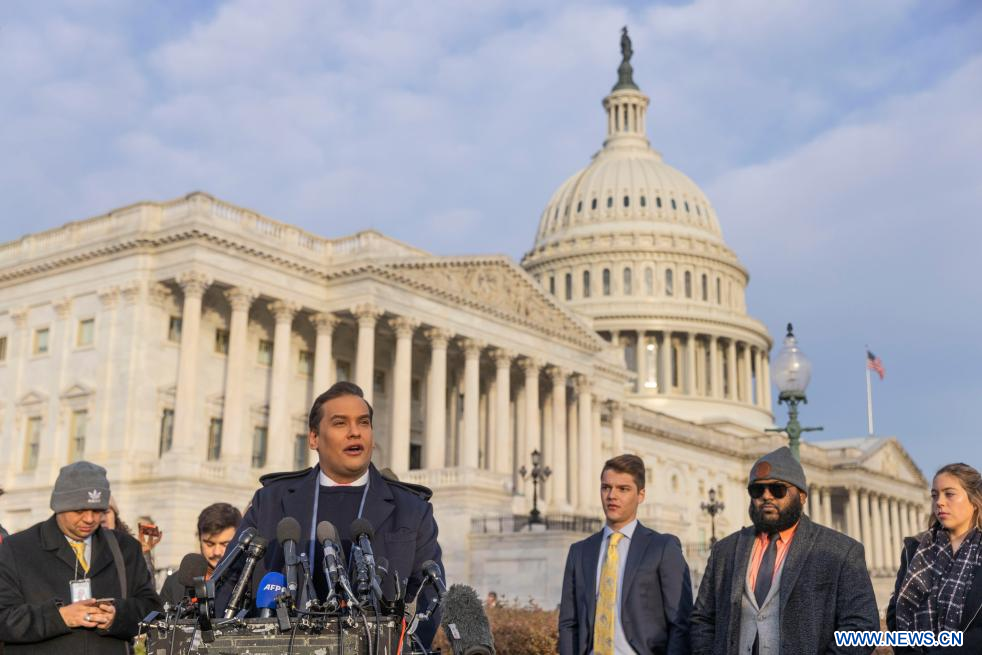 WASHINGTON, 1 diciembre, 2023 (Xinhua) -- Imagen del 30 de noviembre de 2023 del republicano George Santos de Nueva York hablando frente al edificio del Capitolio, en Washington, D.C., Estados Unidos. La Cámara de Representantes de Estados Unidos votó el viernes a favor de expulsar a George Santos del Congreso por las mentiras, escándalos y supuestos delitos sobre el financiamiento de campaña. (Xinhua/Aaron Schwartz)