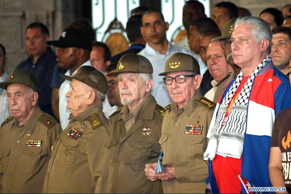 Imagen del 27 de enero de 2024 del presidente cubano, Miguel Díaz-Canel (d-frente), Raúl Castro Ruz (2-d-frente), líder de la Revolución cubana, y el comandante de la Revolución, Ramiro Valdés (3-d-frente), participando en un acto celebrado en homenaje al Héroe Nacional José Martí en el aniversario 171 de su natalicio, celebrado en la escalinata de la Universidad de La Habana, en La Habana, capital de Cuba. Miles de cubanos, en su mayoría jóvenes estudiantes universitarios, reeditaron el sábado la tradicional Marcha de las Antorchas, que honra al héroe nacional José Martí, en vísperas de su natalicio número 171 que se celebrará el domingo en toda la isla. (Xinhua/Joaquín Hernández)